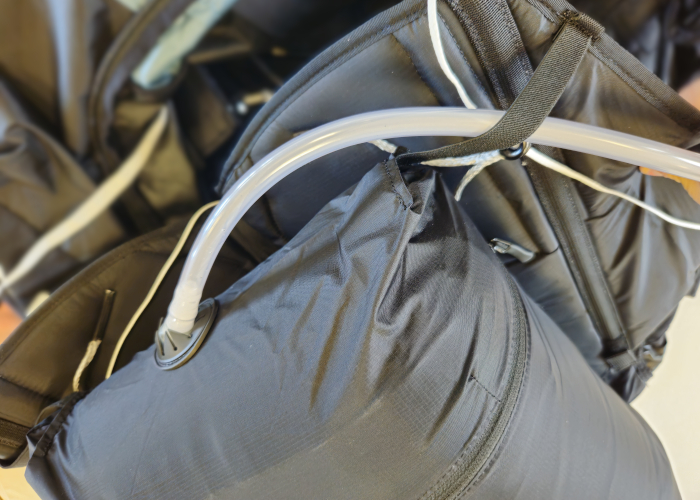 Espacio para el material. La ARTUS ofrece mucho espacio para llevar material gracias a sus diversos bolsillos y compartimentos. El más grande es el compartimento dorsal. Tiene también un bolsillo con cremallera a cada lado del carenado, así como otro debajo del asiento. El bolsillo canguro desmontable a la altura del pecho puede utilizarse para llevar objetos pequeños, como una batería auxiliar o una barrita energética. En el portainstrumentos y las hombreras hay piezas de velcro para fijar instrumentos. También tiene un conducto para guiar el tubo de la bolsa de hidratación desde el compartimento trasero, y una salida para el tubo de la orina.