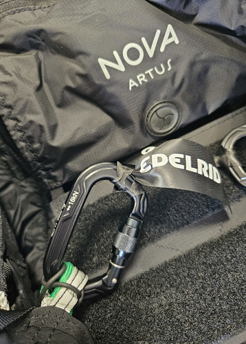 Lista para despegar. Es importante cerrar correctamente la ARTUS para poder despegar de forma rápida y segura. El diagrama de las perneras muestra cómo conectar correctamente las cintas de colores con sus correspondientes anillas y pasadores metálicos. El código de colores para cada lado corresponde al esquema habitual de la mayoría de los parapentes NOVA, lo que reduce la posibilidad de cerrarse mal la silla, y es rojo para la izquierda y verde para la derecha. Los mosquetones EASE Aerotec de Edelrid, especialmente desarrollados para el parapente, garantizan un peso mínimo con una resistencia máxima. Para ver las instrucciones paso a paso, consulta el manual o echa un vistazo a nuestro tutorial.